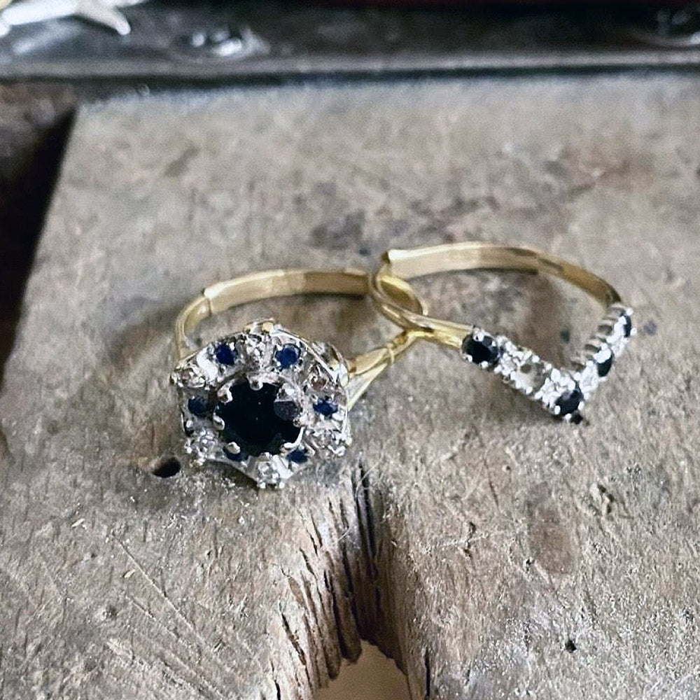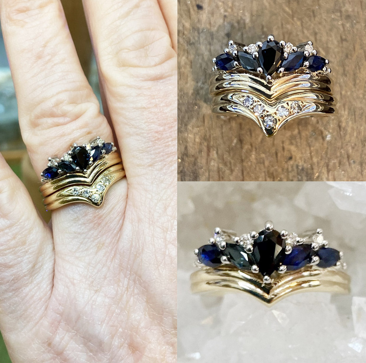 The design brief was for a crown ring, so I sourced matching sapphires and made this pretty ring. I combined her gold, sapphires and diamonds along with some broken chains and odd earrings that she had to make this ring for her.