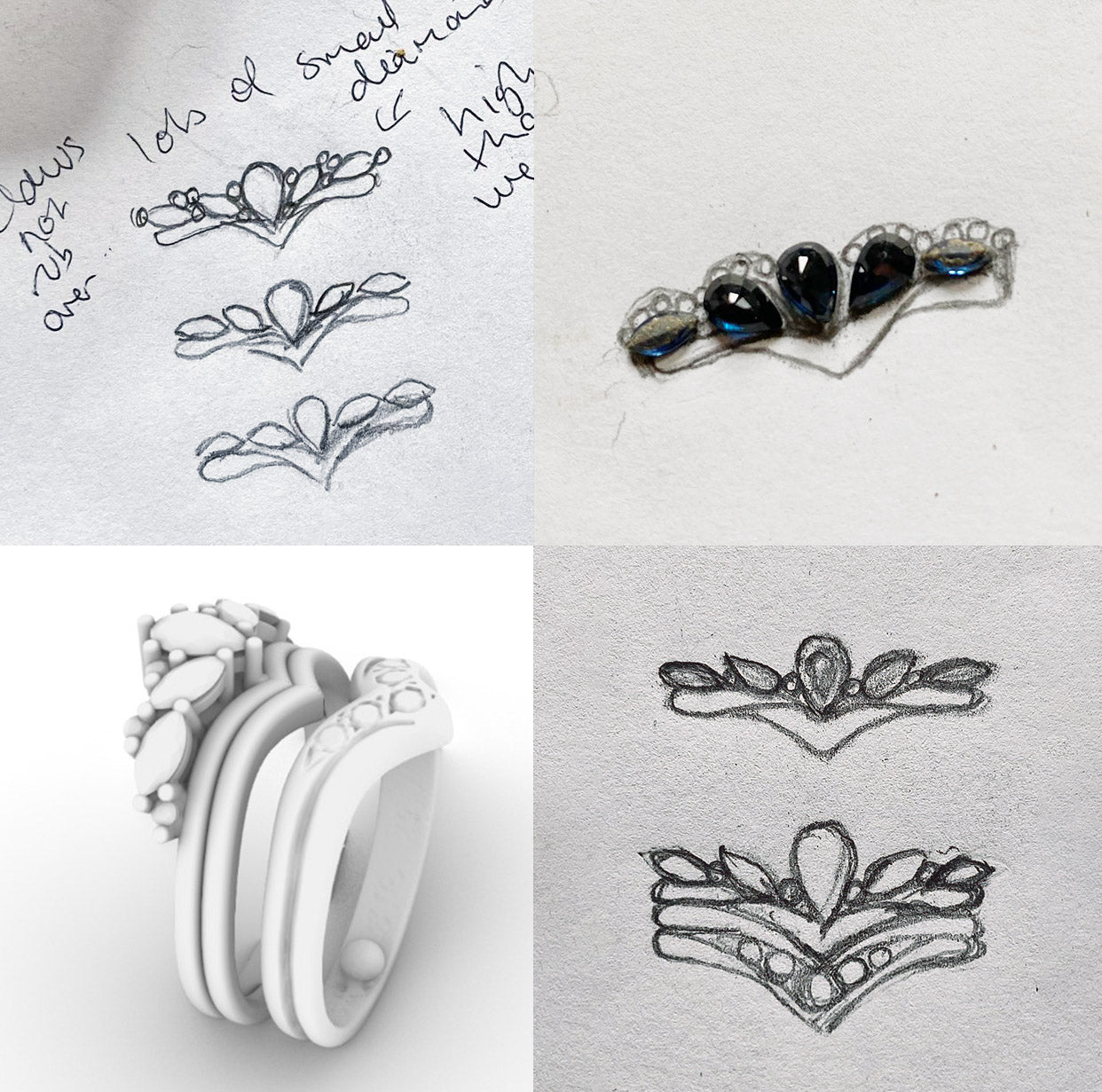 We agreed on platinum as it is very hard wearing, strong and pure metal and Laura wanted to use the small diamonds, but not the small sapphires. I designed a flowing, classic design where the round sapphire is held in the centre, hugged by two arms of graduated diamonds."