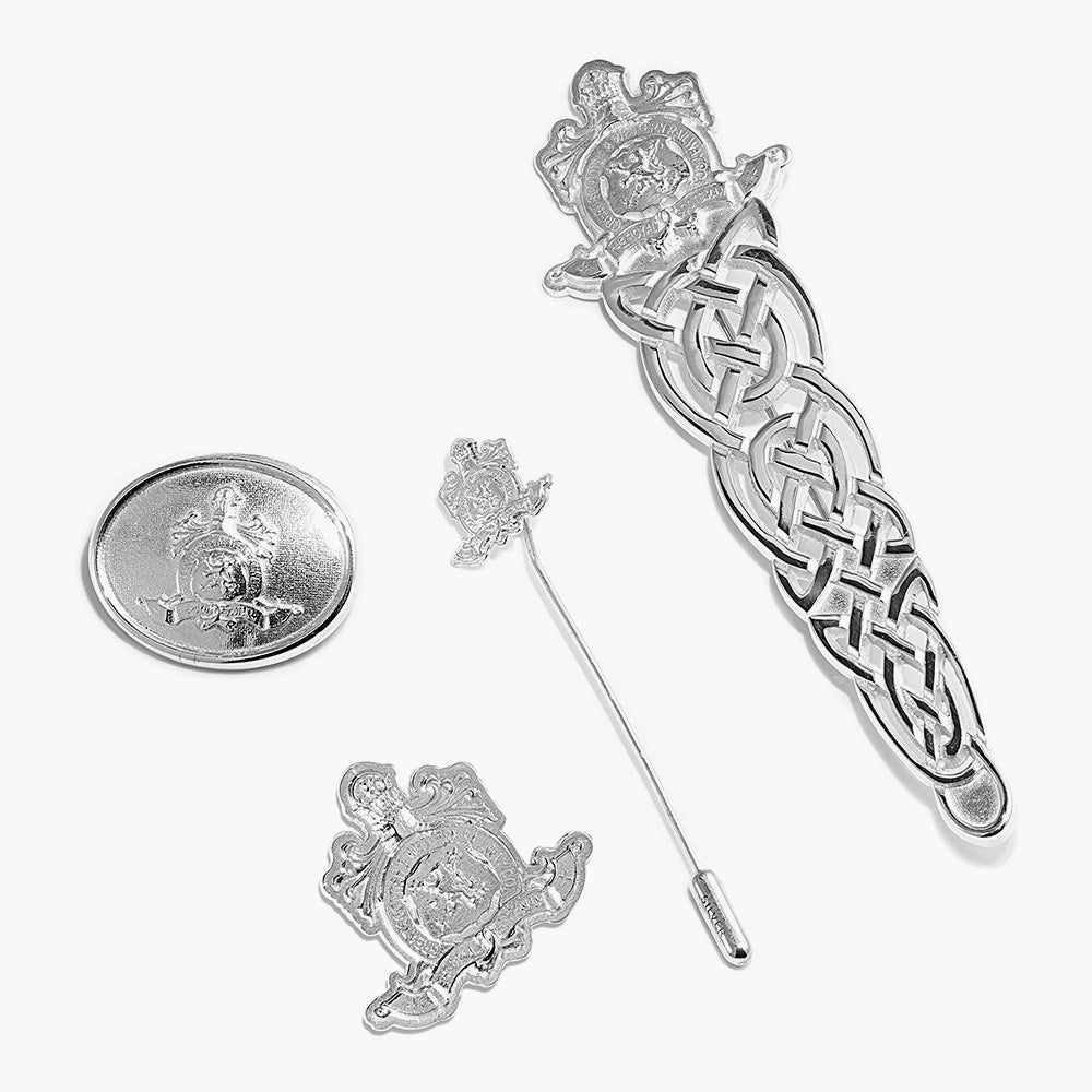 A kilt pin, stick pin, cap pin, and brooch all made in sterling silver. These were designed for the Royal Scotsman Train and feature their crest logo. These pieces were made to be sold on the train and gifted to special clients